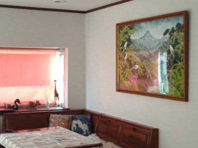 先日さいたま市の橋爪様宅へ作品の取り付け作業に伺いました。 作品は橋爪様がバリ島でご購入された油絵数点と、 猫のカレンダーを額装したもの。 それと古い中国の作品を裏打ち&マット装をさせて頂きました。 橋爪様のご自宅はセンスの良い白亜の外観で、内部も空間の広々としたユッタリと落ち着いた空間でした。 その中にバリ島作家の額装作品を設置したところ、お部屋が今まで以上に明るく開放的な雰囲気になりました。